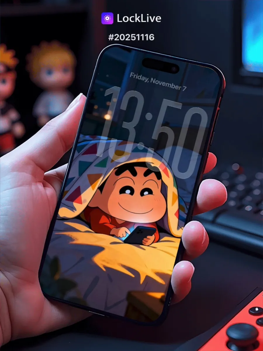 No.20251116 क्रेयॉन शिन-चान ब्लैंकेट के नीचे फोन पर खेलते हुए लाइव वॉलपेपर